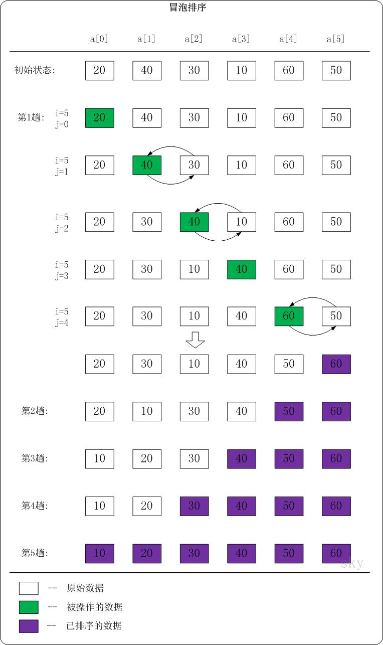 下面以数列 a = {20, 40, 30, 10, 60, 50} 为例,演示冒泡排序的过程。