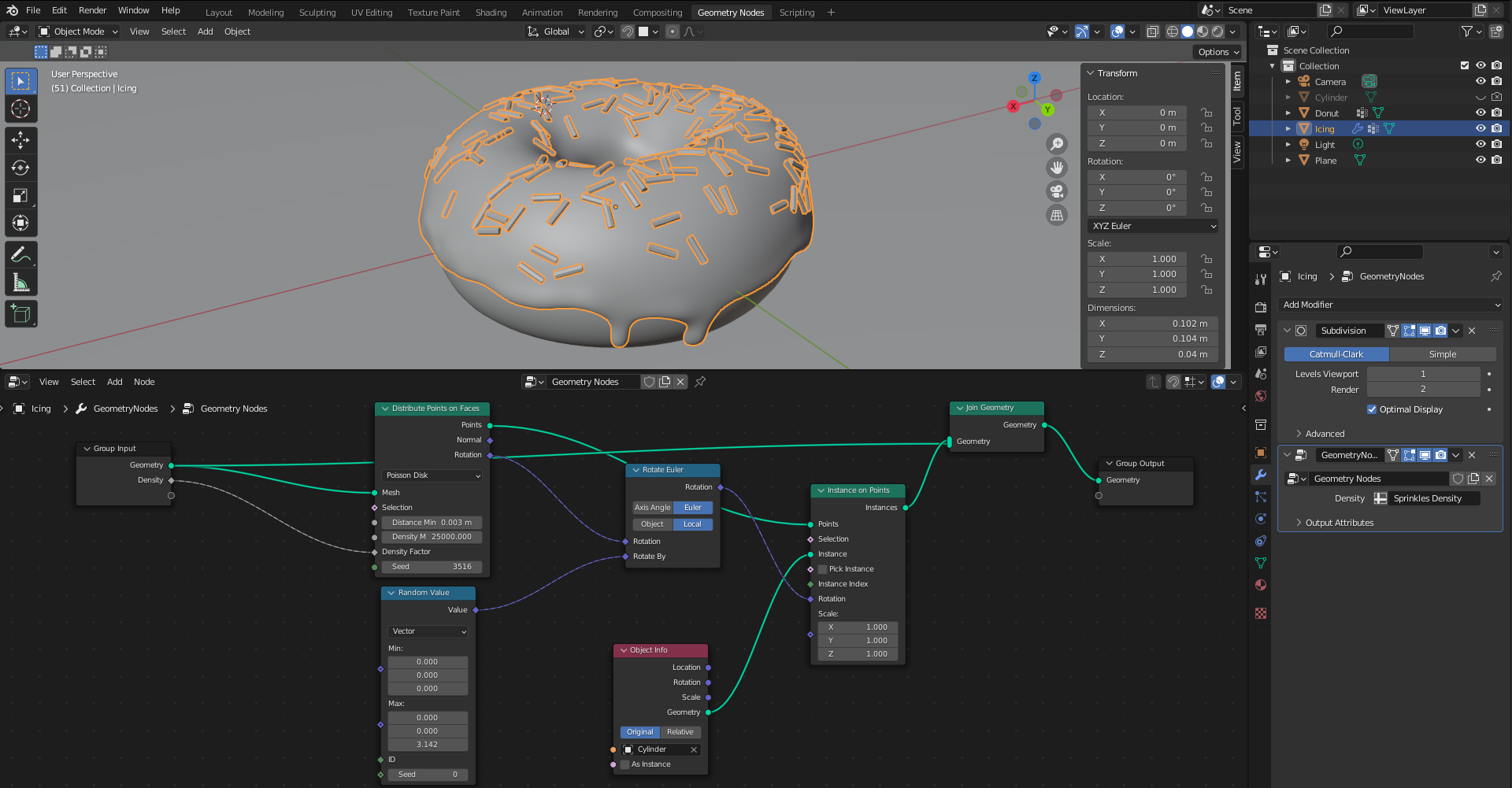 实例化于点上(Instance on Points)— 此节点可将输入所提供的物体放置到点上。这里将弄好的Cylinder物体输入到此节点的实例(Instance)上,让节点将Cylinder物体作为彩色糖实例化于分布点与面上(Distributed Points on Faces)节点生成的点上。