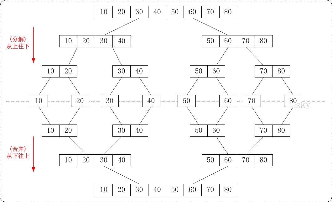 由上往下的归并排序采用递归的方式实现。其原理如下图: