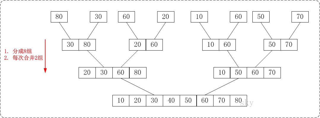 - 将这 2 个有序的子数列两两合并,得到 1 个有序的子数列 {10,20,30,40,50,60,70,80}。