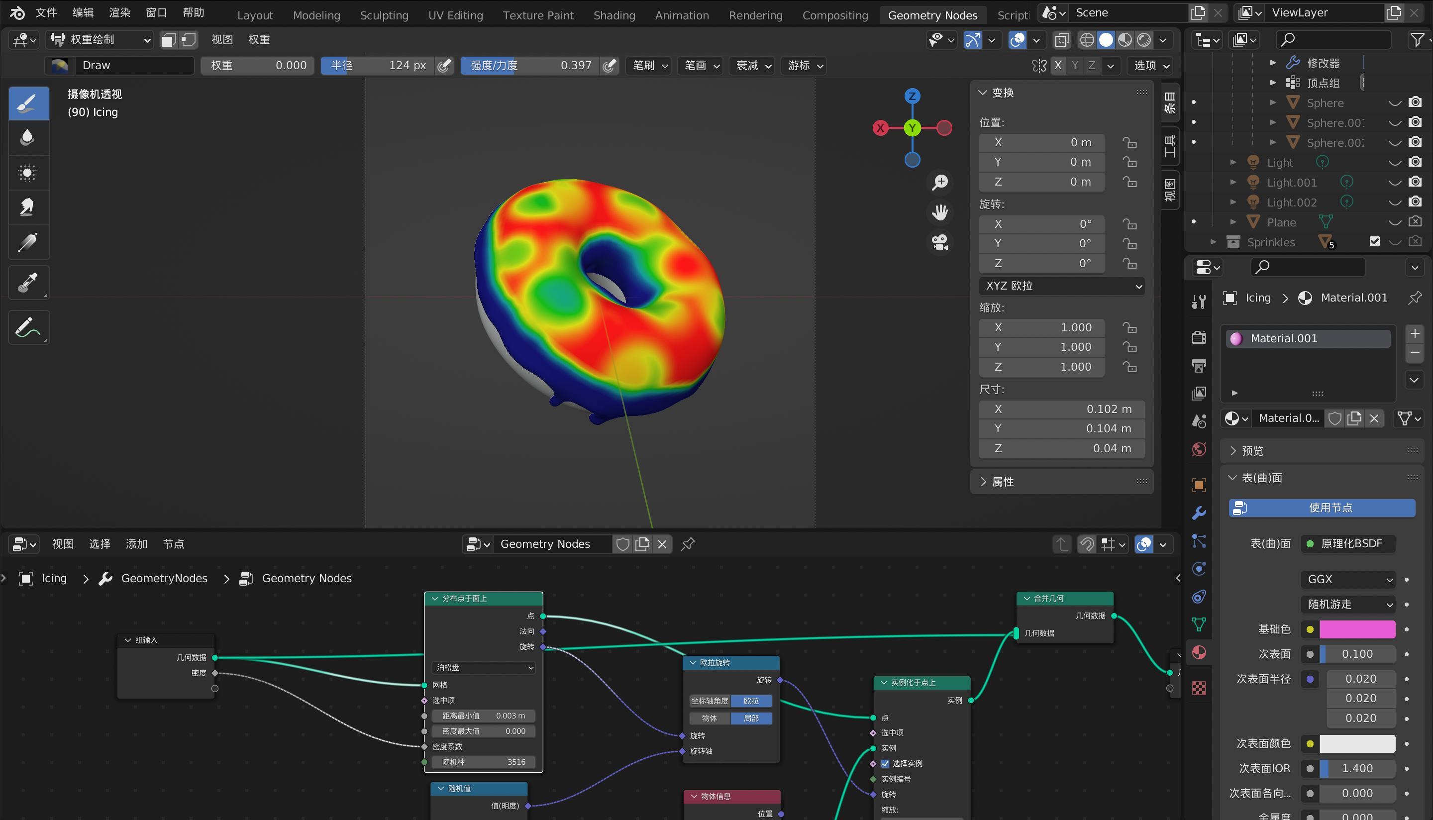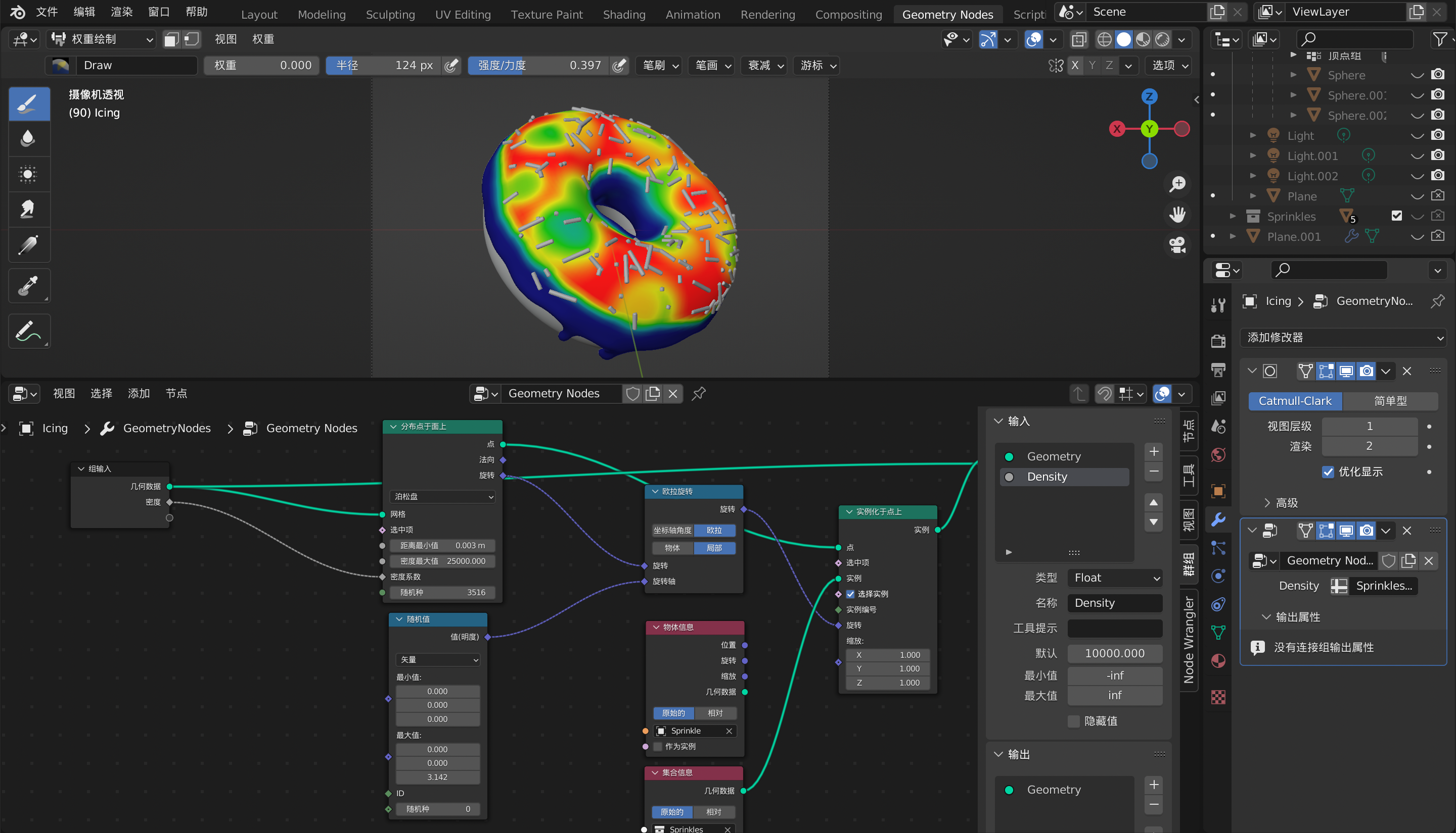 以上是绘制权重图,并输入到节点之后甜甜圈的渲染图,可见甜甜圈表面上的彩色糖是根据先前绘制好的权重图分布的。
