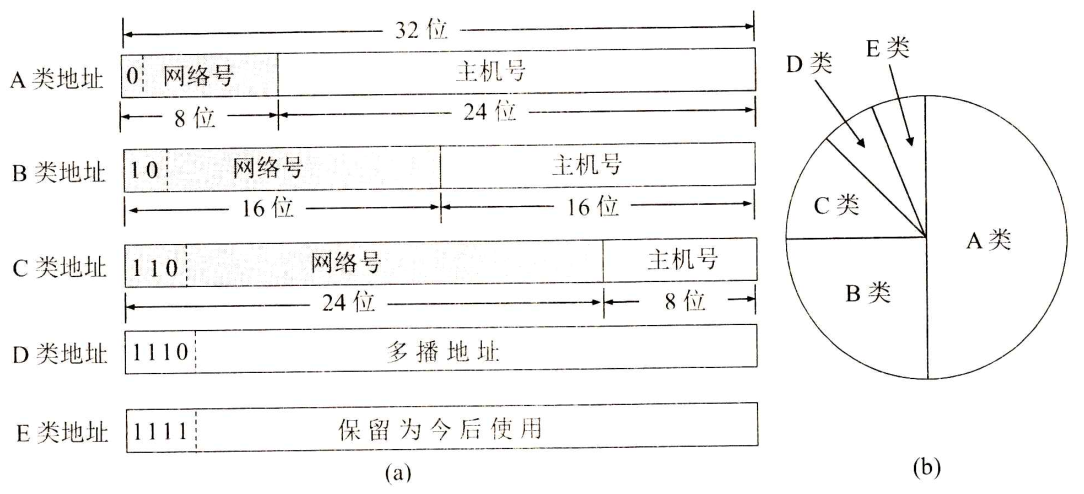 IP 地址被分为 A, B, C, D, E 五类,每一类地址都包含网络号以及主机号两个字段。其表示方法为点分十进制记法 (dotted decimal notation)。