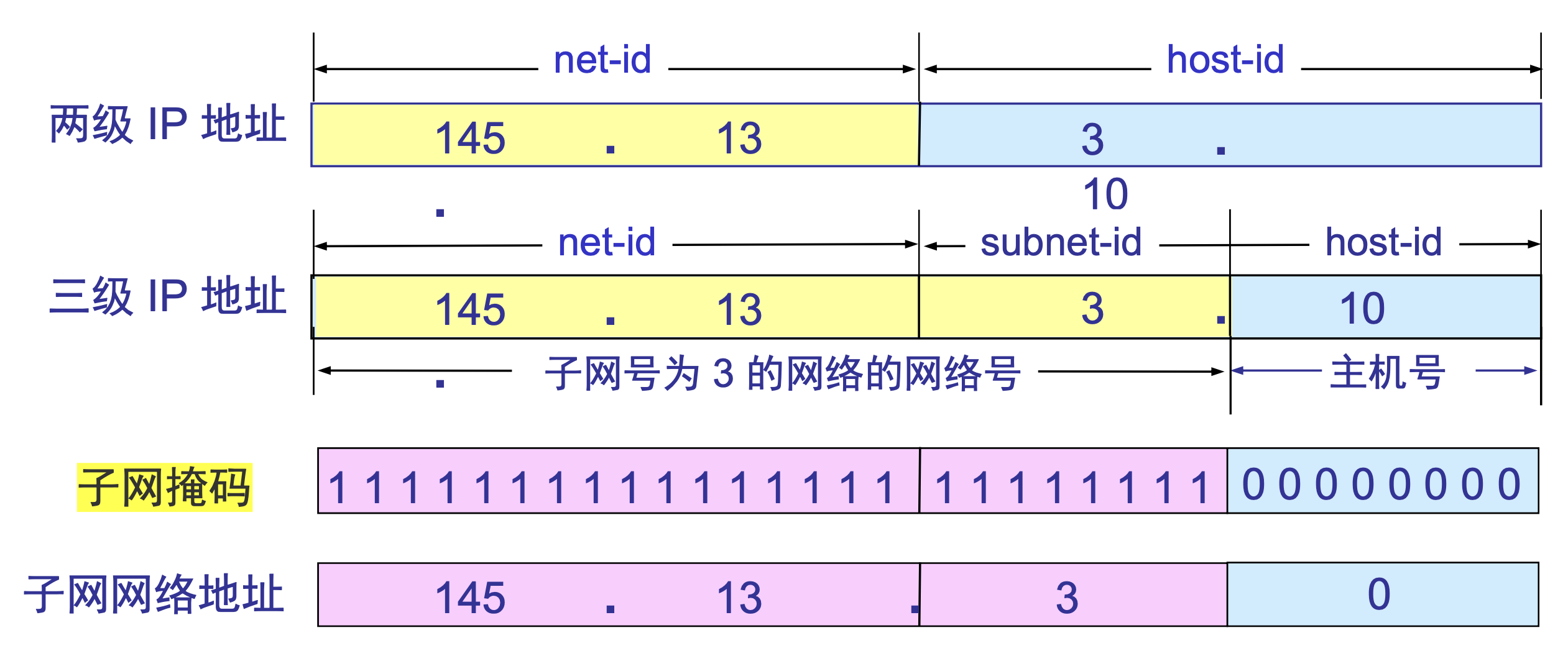 一个拥有多个物理网络的单位可按照物理网络划分为若干个子网 (subnet)。划分子网的方法是从网络的主机号借用若干位作为子网号 (subnet-id)。因此两级 IP 地址在本单位内部就变为了三级 IP 地址。
